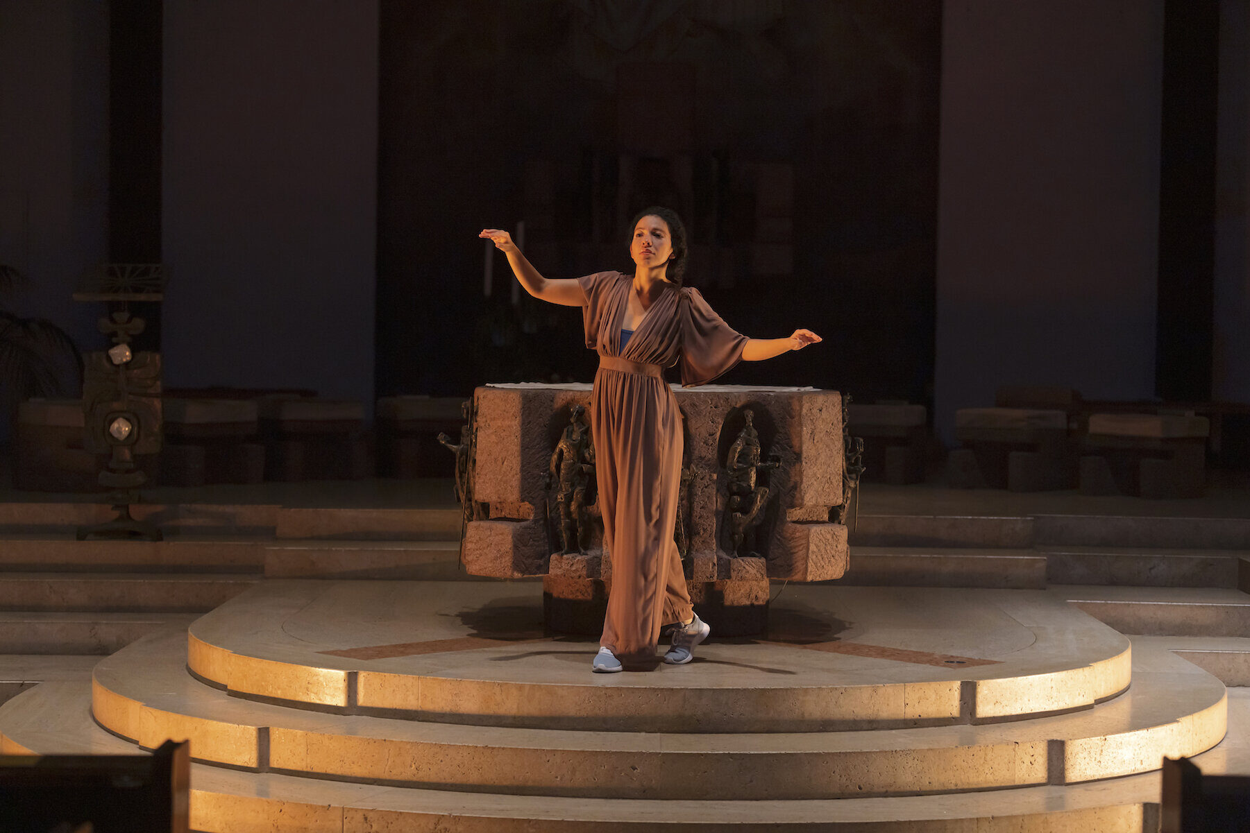 We honour what we are today, here and now and what we mean to each other. Both the dancers and the church carry personal stories, testimonies and rituals that inform this particular celebration. With simplicity, vulnerability and joy, we invite the viewers to be part of this fest. Our dance language accompanied by a original music composition is a stylistic device that we offer, in order to create a continuous flow that distorts the time and carries not only us as performers but also the audience into another mental space, just as religious rituals do.